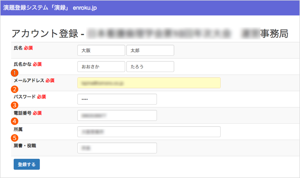 06-6353-6977必須 項目(❶~❺)を入力し登録するをクリックしてください