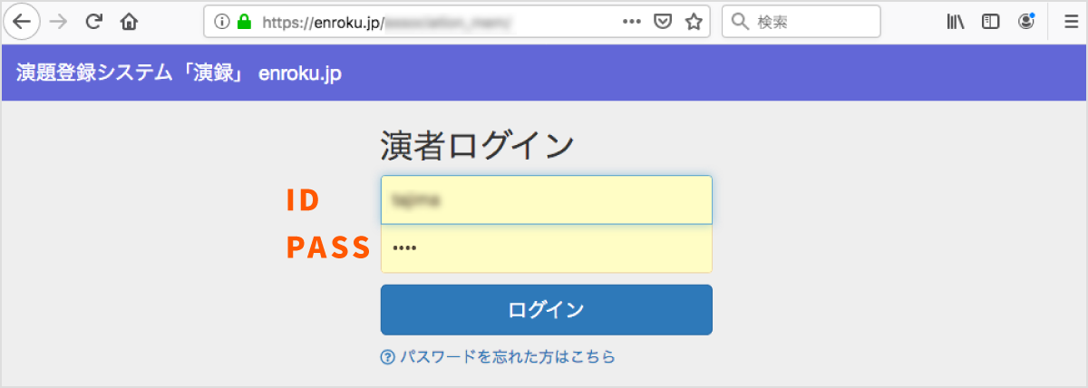 【該当する学会のURLページより】メールに記載のIDとパスワードを入力しログイン作業を完了してください