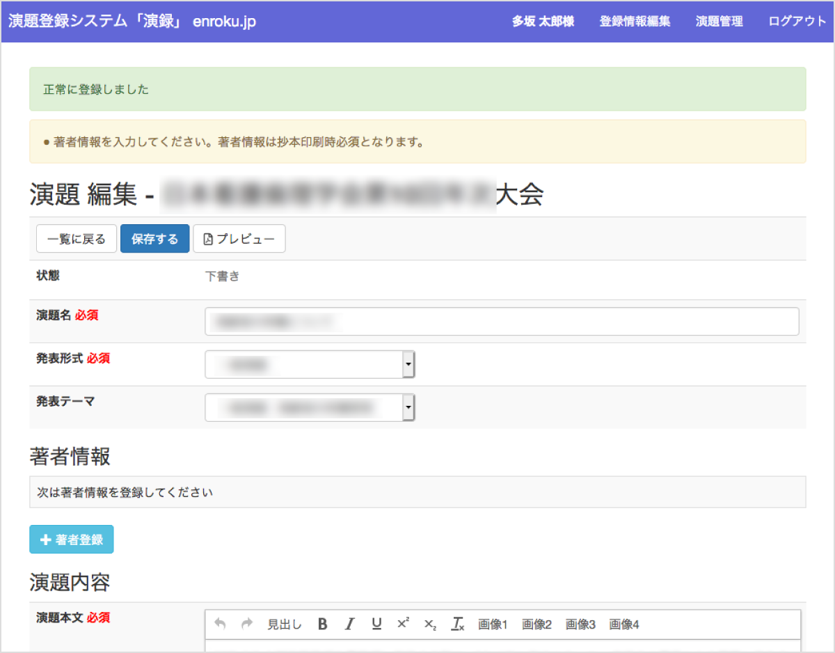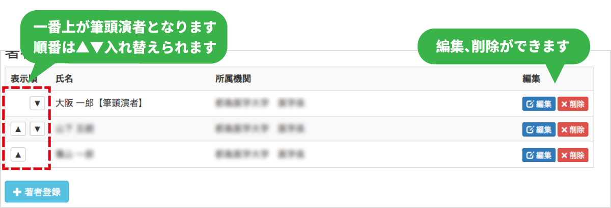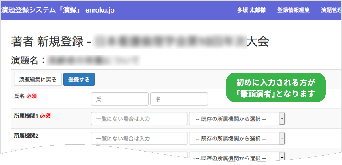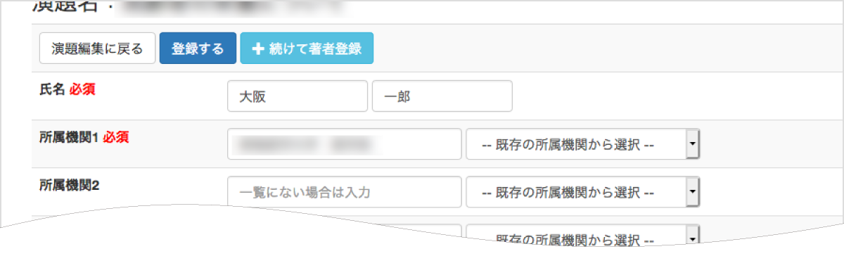 「筆頭演者」の情報を入力し登録すると次からは「共著」の情報の入力となります